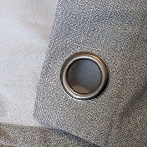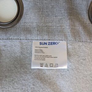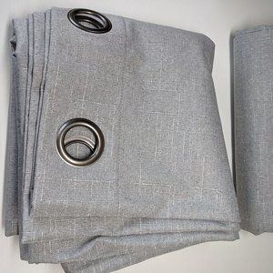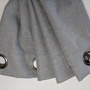 Sun Zero Channing 50"W x 84"L Sterling Grid Texture Draft Shield Fleece Insulated 100% Blackout Grommet Curtain Panel. Set of 2. Gently used, changed mind on decor style for room. Like new condition! No stains, tears, etc. Pet free and smoke free home. Extremely effective for both light blocking (blackout) and temperature control/energy savings (fleece lining). Medium grey color, textured weave fabric finish. Grommets could be described as either a Gunmetal or a dark Brushed Nickle.