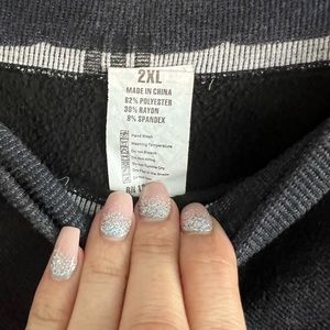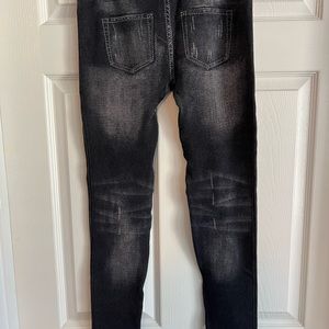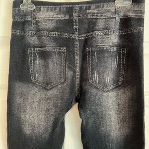 Fleece lined blue leggings. Look like denim front and back. Non functional pockets and the holes are not real holes. The tag says size 2x but fit more like XL. Very stretchy. Black fleece liner on inside very warm
