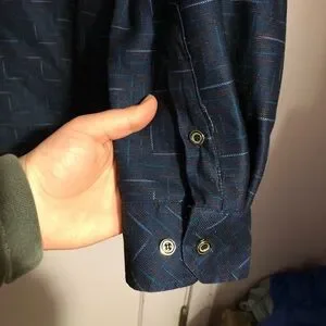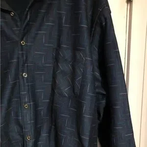 Navy blue patterned jacket. Size XXL. Good condition, minimally worn. The inside and outside material are soft, the inside is a micro fleece type of material. It has buttons down the front for closure. It would be good for spring and fall weather, or mild winter weather.