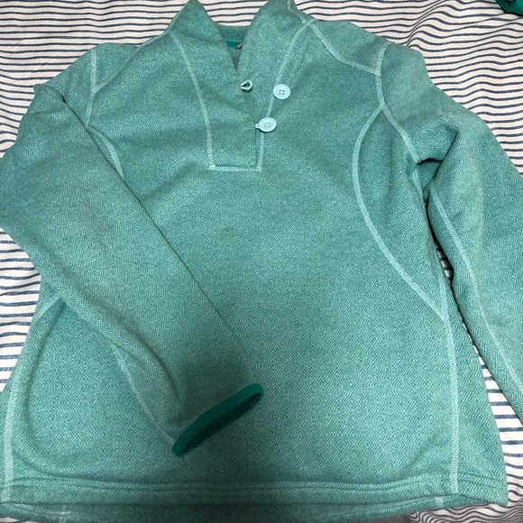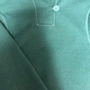 Green and white patterned pullover. Buttons on the neck and tailored fit.