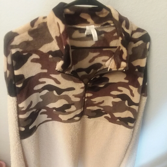 Half zip fleece pullover is so soft and warm. Size medium. Bottom is warm fleece, top camo print is a soft velvety texture.