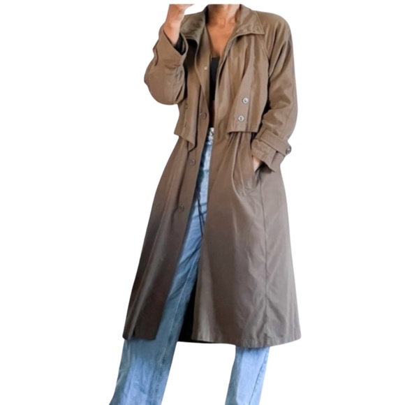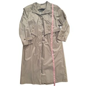 Tags: Vintage trench coat, long overcoat, minimalist outerwear, tailored coat, women’s petite trench, classic gray coat, mid-length coat, retro style outerwear, double-breasted trench, timeless wardrobe staple.