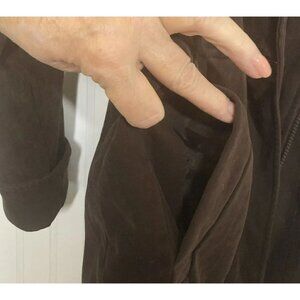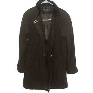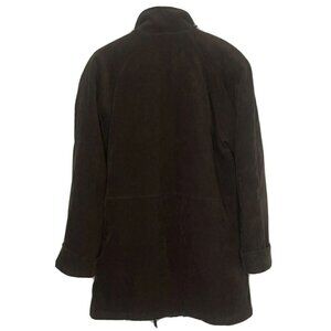 EUC Preowned please review pics to ensure this faux suede cinch waist adjustable toggle button zip closure chocolate brown black contrast collar