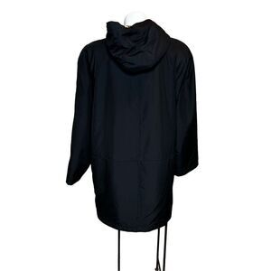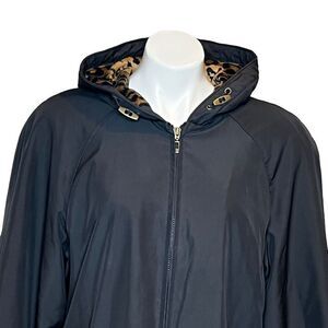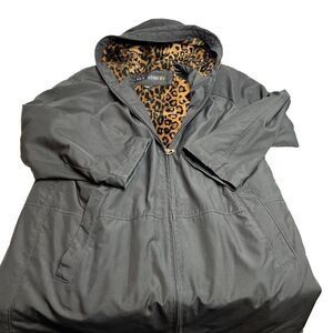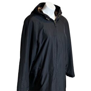 Fleet Street black waterproof zip up rain coat size L. Hood and partial inside lining leopard print fur. Hood can be cinched. Front pockets. Good condition. Some piling on the inner lining. Shell 100% polyester. Lining printed part- 100% polyester the satin 80% polyester 20% cotton. Length 34” Chest 22”.