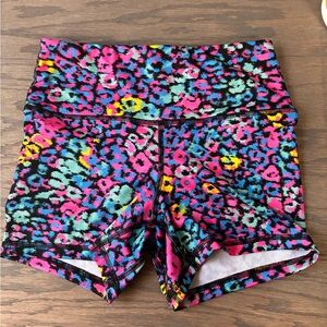 Dynamic shorts with a bold leopard pattern. Features pink, blue, yellow, and black. In excellent condition