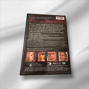 This is the long out-of-print Criterion Collection DVD release of Flesh for Frankenstein, fully restored and presented in its original widescreen aspect ratio. Known for its blend of satire, horror, and provocative style, this edition has become one of the most sought-after Criterion titles.
