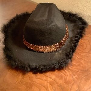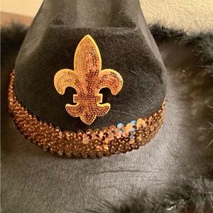 New without tags. Designed by me. One size fits most. It has an adjustable drawstring that fits under the chin. It is a lightweight felt hat with faux feather trim.