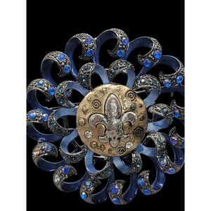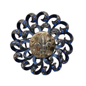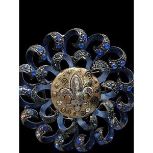 Fleur De Lis Swirl Brooch Royal Blue Gun Metal Gray Rhinestone Sparkle