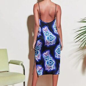 Featured here is the Fleur Du Mal Butterfly Silk Slip Dress: slip dress made of stretch-silk with electric butterfly designs.