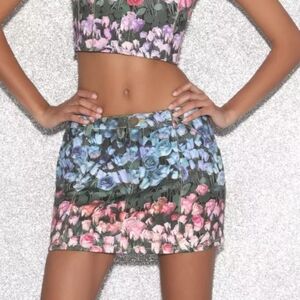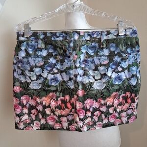 Vibrant floral print mini skirt with pink, blue, and green hues. Perfect for a stylish look.