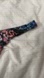 Stylish thong panties with a vibrant floral print. Features shades of pink, purple, and blue on a black background.