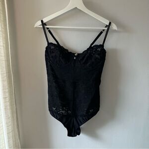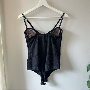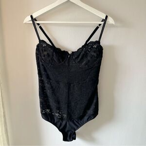 Our favorite Charlotte Balconette Bodysuit. Stretch lace bodice with soft mesh lining, underwire cups and scalloped trim along the top. Adjustable straps. Bottom is made of opaque black jersey with a thong back and snap closure. Amp up your downtown look by pairing with your favorite boyfriend jeans.