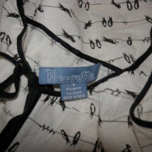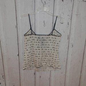 Up for sale is a rare, cute Fleurette Junior's Size Small ivory & black bird on a wire graphic print adjustable spaghetti strap tank top camosile shirt. Rare. Thin material. Bow tie keyhole bust. 100% Cotton.
