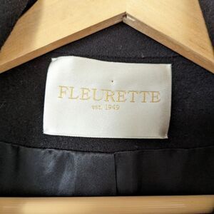 Fleurette mid length peacoat in black. Wool and cashmere blend, fully lined, wide collar, three large button front (spare button is included in one of the two front pockets). Super soft, heavy weight, cozy and classic luxe luxury winter staple. Gently worn, excellent condition, no holes/stains.