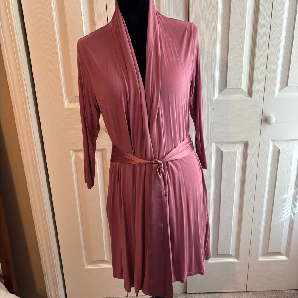 Blush robe from Fleur't! Unbelievably soft and comfortable. Has an internal loop tie with an external satin ribbon tie. Perfect for a bridesmaid gift. Fits true to size for a small or medium.
