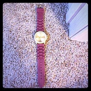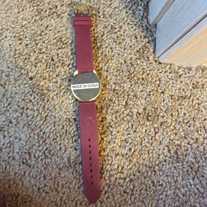 Burgundy color with gold face and rhinestones around it. Brand new and never worn