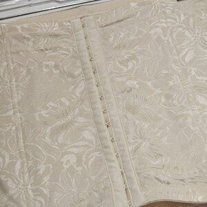 In excellent pre-owned condition, only worn once. Beautiful beige/ivory/nude color with damask satin print. Great for under a wedding dress! Hook and eye closure, measurements on photos.