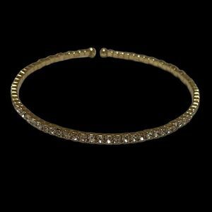 Beautiful flexible gold tone rhinestone bracelet that will fit just about any wrist. Beautiful single layer of rhinestones set in gold tone open bracelet. Wear it with anything.