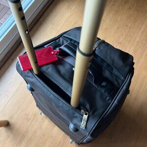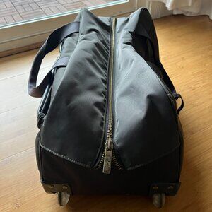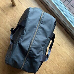 Duffle meets roller bag! Used on one trip. Perfect condition, holds so much more than you think! Modern retro design with sturdy clear wheels and a retractable handle. Can be used as a duffle or roller bag and fits seamlessly under an airplane seat or in overhead compartment as a carry-on. Grey exterior with blue interior. Happy to include the Flight 001 red luggage tag if desired.