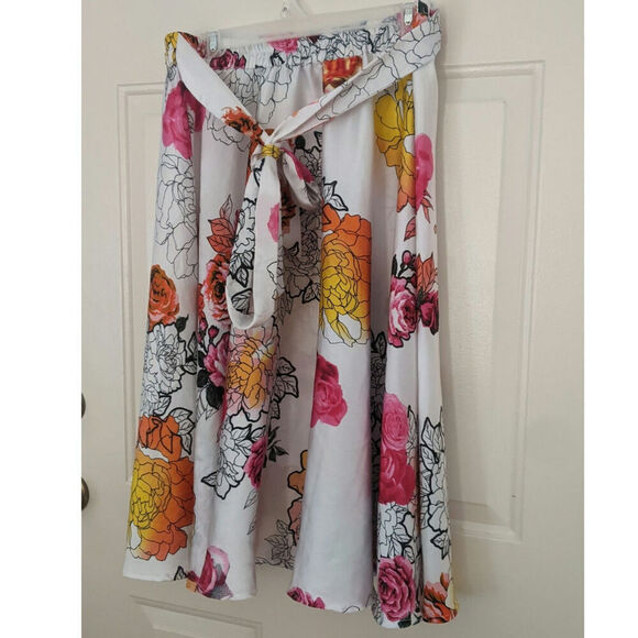 Flowy midi floral skirt with tie, unique art to wear design, size large, elastic waist, super comfey