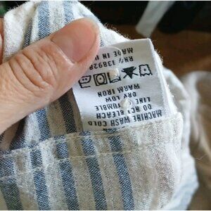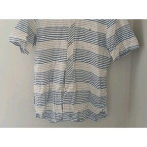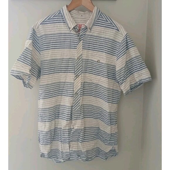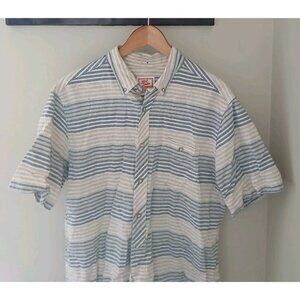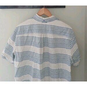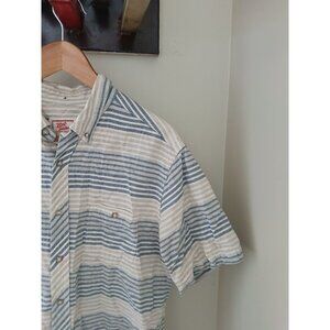 Flint and Tinder Short Sleeve Button Down Shirt. Size XL. Blue and tan stripes. Cotton and ramie blend. Textured feeling similar to linen material. In nice, preowned condition. No flaws noted. Measures approximately 22" pit to pit, 30" shoulder to hem.