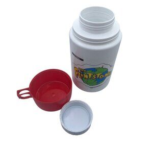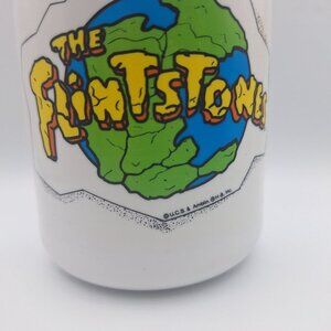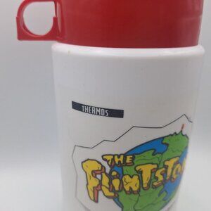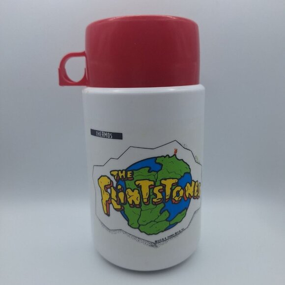 Step back into the 90s with this Flintstones thermos, featuring a vibrant red cup lid. Perfect for collectors or anyone seeking millennial nostalgia. Ideal for hot or cold drinks.