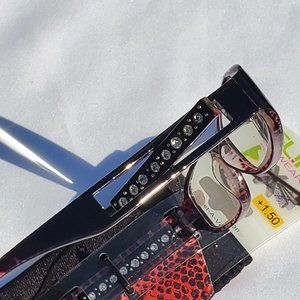 You will love these beautiful reading glasses from Select-A-Vision. These glasses feature a black frame with an snakeskin print on the bottom of the frame and at the temples which matches the included case and a +1.50 strength. These fun glasses feature a choice of a snakeskin print or rhinestone embellishment on the temples.