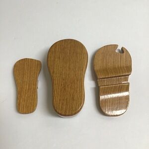 Beautifully-made wood flip flop jewelry box puzzle with hibiscus flower accents and red velvet liner. Glossy polished woodgrain finish. Excellent pre-owned vintage condition.