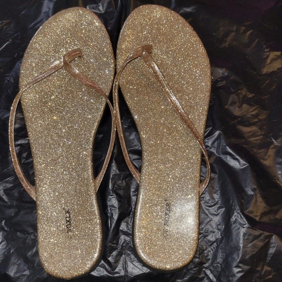 Gold flip flops. Size 7/8 medium. Cute. Still looks of life left. K17
