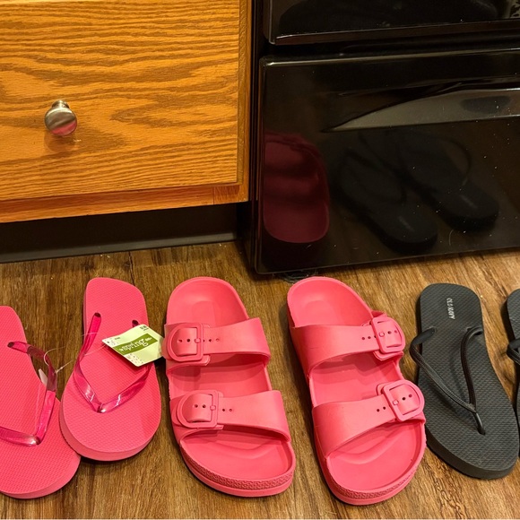 Bright pink slide sandals with adjustable straps NWOT. Bright pink flip flop nwt. Black flip flop good used condition. Perfect for casual wear.