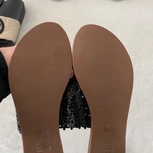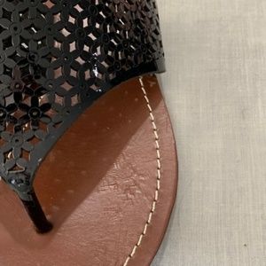 Tory Burch laser cut Flip flops, leather soles, worn maybe 3 times. There are some small indentations in the left flop towards the pinky toe.