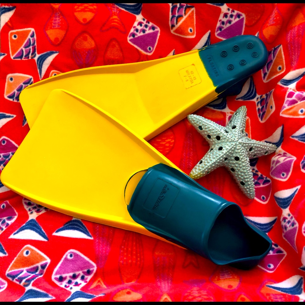 Size 7-8 Flippers in that sturdy solid rubber, not your cheap plastic flippers. These are in excellent shape. Will ship out quickly!