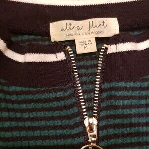 Flirt Juniors Size Medium Green Stripe Mid Zip Ruffle Short Sleeve Top