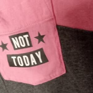 Trendy tee with 'Not Today' graphic. Features a front pocket. Stylish color block design.