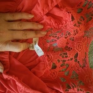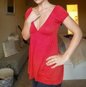 Top is Red - Small - Made by Love Culture - Worn Gently - Material is very stretchy - Deep Vneck in front - Swooped Bateau Neck on back - Beautiful embroidered back with floral designs.