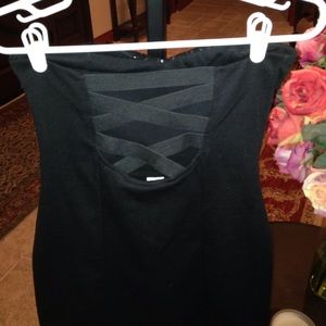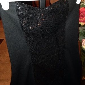 Black, strapless, body-con dress; sequins down the front of the dress with a cutout in the back; used- good condition