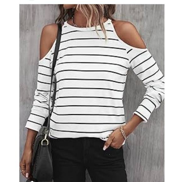 Flirty, romantic cold-shoulder striped blouse with soft goth undertones and a sleek city-glam vibe. Black + white stripes, exposed shoulders, and a flattering drape make this perfect for date night, evening outings, concerts, cocktails, or modern soft-goth styling.