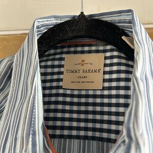 Striped Tommy Bahama long sleeve turned flirty fit. Cropped with rainbow crochet trim to add some dopamine to your day. Machine washable, gentle cycle. Originally a large.