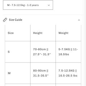 Size is 90 which is a Medium on the chart (last photo) and equivalent to ages 1-2 years old or 31.5-35.5 in height.