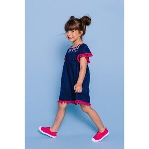 Floatimini Girl's Cover - up Dress - lightweight 100% Cotton navy blue dress, cute angel-style short sleeves with adorable pink pompom trim. The neckline features an embroidered floral & geometric pattern. This fun dress is perfect for the pool and is easy to pack for a vacation.
