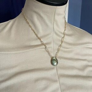 Gorgeous floating labradorite gemstone on a 16”paperclip gold plated necklace is brand new. This beauty shares flashes of gold and green, depending on the position light hits it. Includes lobster claw closure and Estrella & Luna jewelry tag. Labradorite gemstone measures 15mm x 10mm approximately. Handmade by Estrella & Luna.