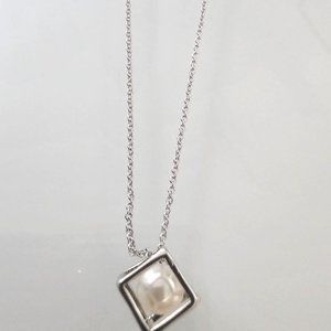 Real pearl on metal chain encased in cube. It's a really nice, simple, dainty piece.