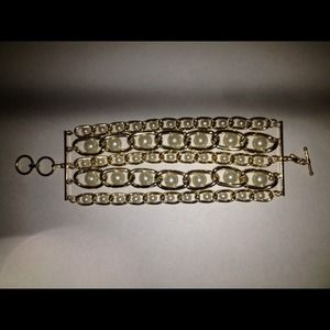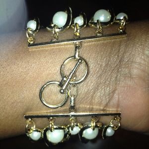 Four link gold bracelet with white floating pearls. A piece that will get your wrist noticed!