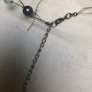 This 16 1/3 in. wire necklace has a silver tone lobster claw plus a 3 in. extender to wear various lengths as shown in pictures. The beads alternate white faux Pearl, clear faceted, and metallic dark gray with tiny holes design. All approximately 10 mm round. It should be straightened a bit but I am not familiar with doing this. The wire near the clasp is obviously tied in a knot with the two wires hanging. It could be pulled tight and cut.