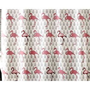 This 72 x 72 inch curtain brightens your space with pink flamingos and pineapples on a gray backdrop.