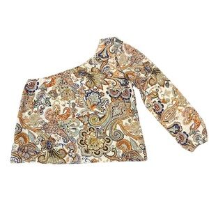 Elevate your style with this chic paisley print one-shoulder top. Featuring a vibrant mix of orange, blue, and cream, this top is perfect for any occasion.