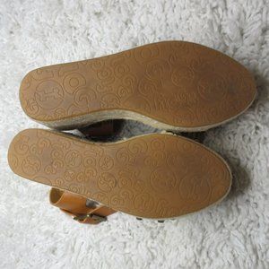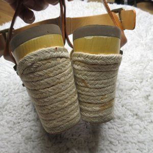 Side buckle sandal with braided trim accents, substantial wood platform, mixes finish leather wedges with antiqued hardware and stud accents.
