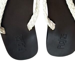 Classic and comfortable Flojos flip flops featuring braided white faux leather straps and a black cushioned footbed. Durable textured outsole for traction. Women’s size 6. Excellent pre-owned condition with minimal signs of wear.
