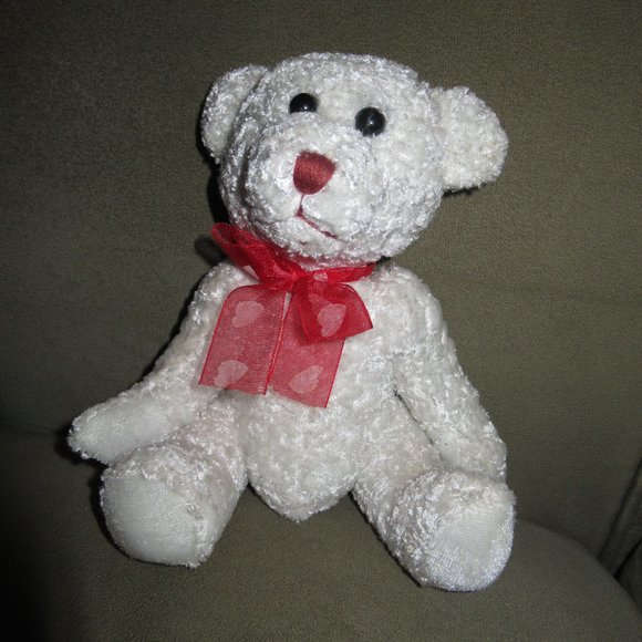 Flomo Valentine's Day Anniversary white plush bear red heart ribbon 6"