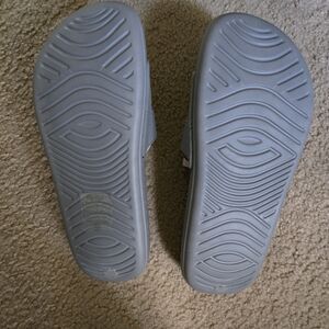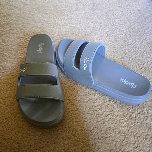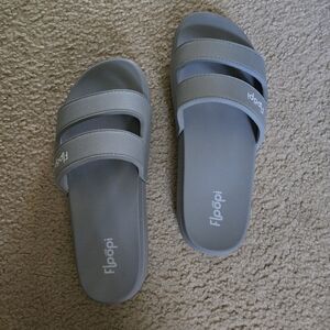 Comfortable gray slide sandals by Floopi. Never worn. Perfect for summer and casual wear. Run about a half size smaller than actual size.